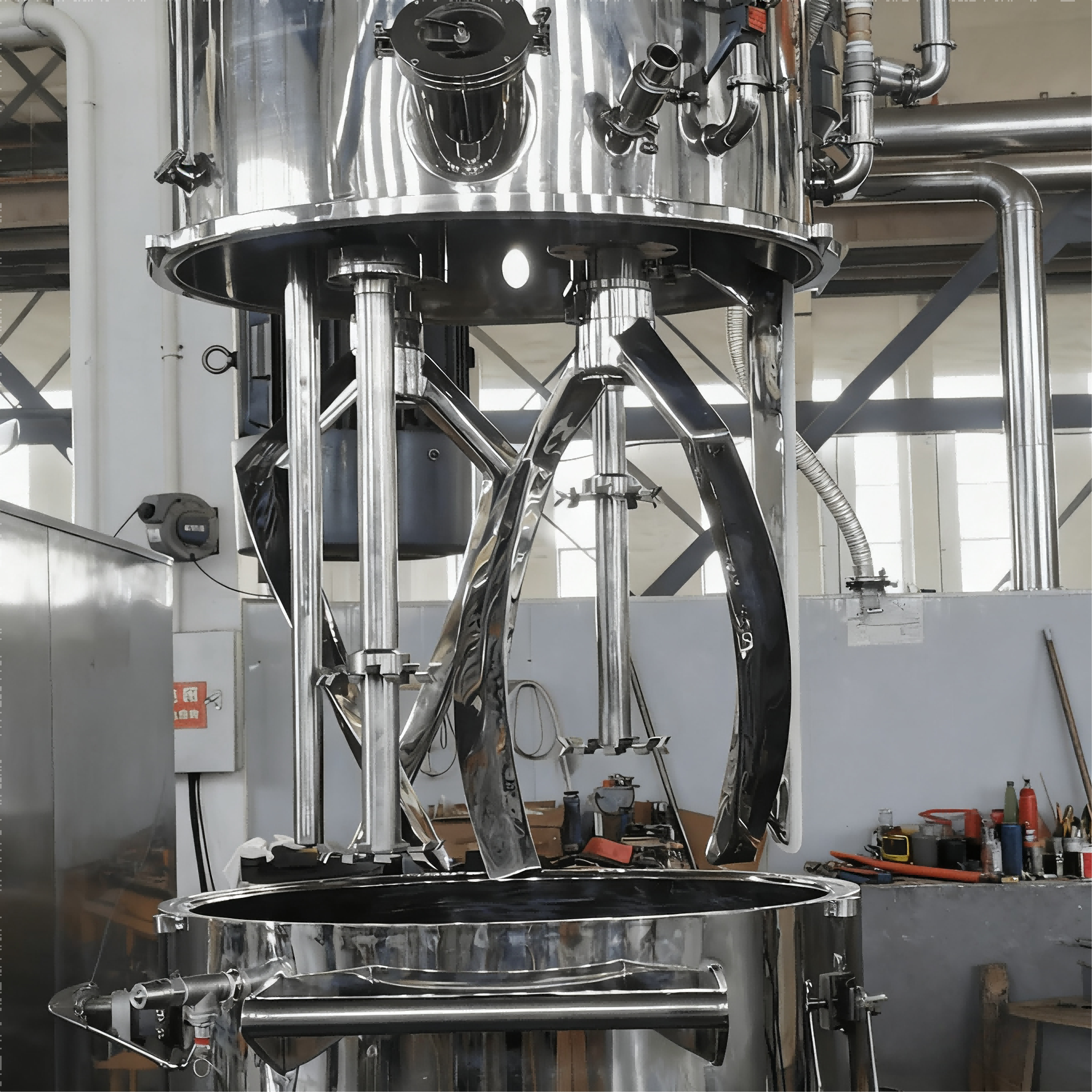 Lem⊑langeur planninguèr Double 500L avec chargeur de presse Est conçu pour répondre aux exigences strictes de la production industrielle à grande échelle, offrant une efficacité et une consistance exceptionnelles pour le mélange de matériaux à ultra-haute viscosité. À son cœur se trouve un système d’agitateur planétaire double robuste: deux agitateurs robustes fonctionnent à des vitesses réglables (0-65 tr/min), tournant indépendamment sur leurs axes tout en orbitant autour du réservoir de mélange en acier inoxydable de 500L. Ce mouvement dynamique génère de puissantes forces de cisaillement, de pétrissage et de pliage, assurant une homogénéisation complète des substances les plus visqueuses — y compris les résines époxy, les caoutchoucs de silicone à haute densité, les onguents pharmaceutiques et les boues composites — jusqu’à 3 500 000 cP, éliminant les zones mortes et garantissant une qualité uniforme du batch.